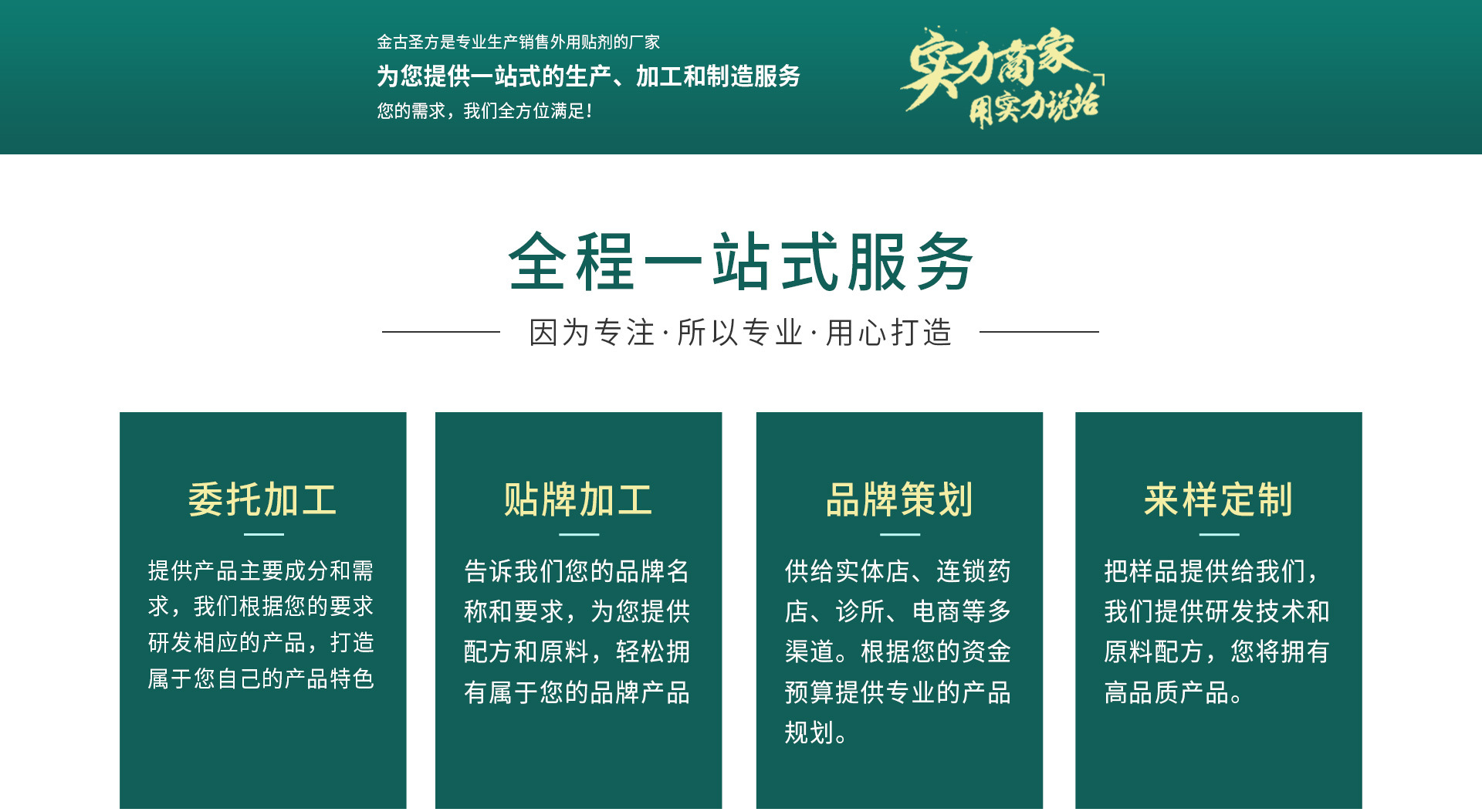 鄭州金古圣方藥業(yè)有限公司&河南金古圣方生物科技開發(fā)有限公司(生產(chǎn)企業(yè)), 弘揚中醫(yī)文化,致力百姓健康!公司主要生產(chǎn)、銷售祖國中醫(yī)五大藥物劑型之一的膏藥貼劑;優(yōu)勢產(chǎn)品:漢方貼小兒穴位貼,失眠貼,眼貼,足貼,前列腺貼,三伏貼,三九貼,鼻炎膏,痔瘡膏,戒煙貼、乳腺貼、口苦口臭貼、小兒化積健脾貼、小兒腹瀉貼、小兒咳喘貼、小兒解感貼、小兒消食貼、筋骨疼痛貼、酸麻腫痛貼、頸肩腰腿貼、萬痛筋骨貼等產(chǎn)品。 金古圣方藥業(yè)公司貫徹"質(zhì)量保障"的原則,以“關(guān)愛生命、關(guān)注健康、奉獻社會”為企業(yè)理念,與國內(nèi)多家醫(yī)學機構(gòu)合作,憑借“誠信、溝通、雙贏、永續(xù)”的經(jīng)營理念,贏得代理商與消費者的良好口碑