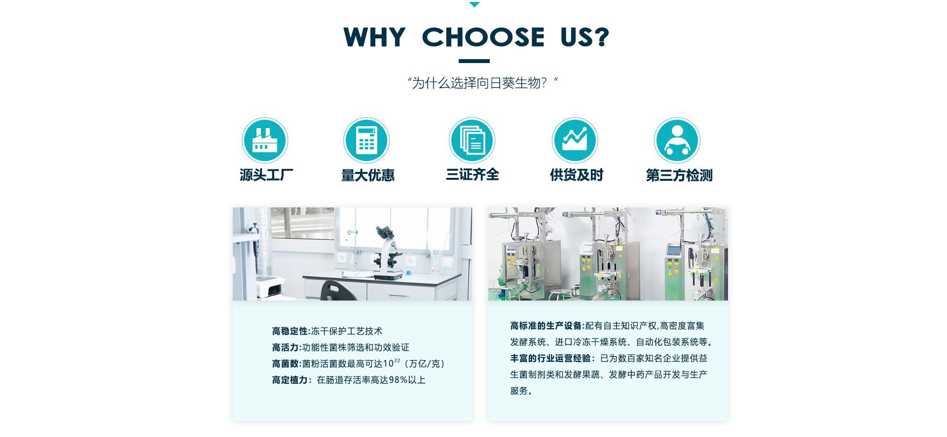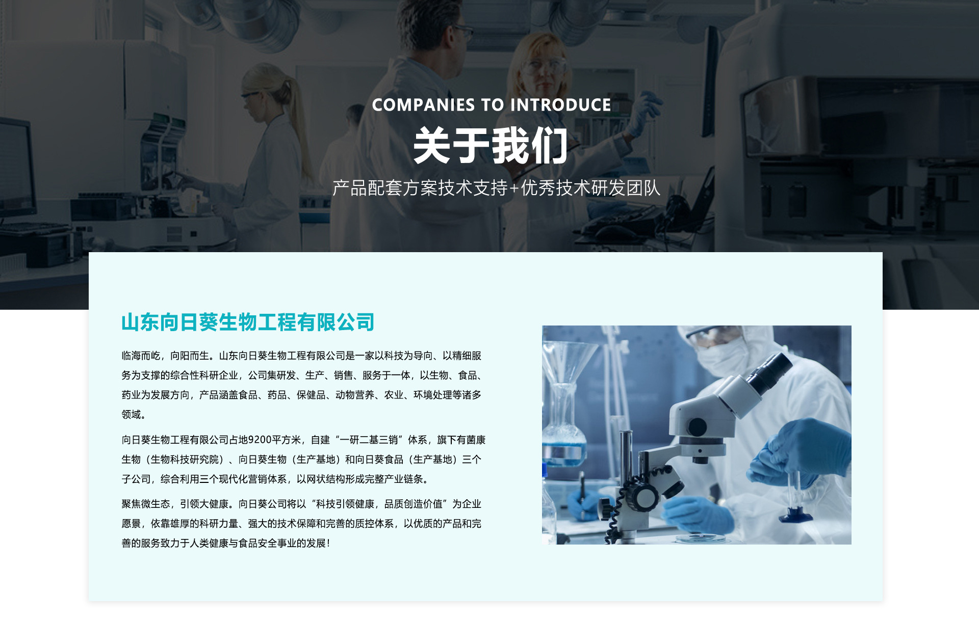 臨海而屹,向陽(yáng)而生。山東向日葵生物工程有限公司是一家以科技為導(dǎo)向、以精細(xì)服務(wù)為支撐的綜合性科研企業(yè),公司集研發(fā)、生產(chǎn)、銷售、服務(wù)于一體,以生物、食品、藥業(yè)為發(fā)展方向,產(chǎn)品涵蓋食品、藥品、保健品、動(dòng)物營(yíng)養(yǎng)、農(nóng)業(yè)、環(huán)境處理等諸多領(lǐng)域。 向日葵生物工程有限公司占地9200平方米,自建“一研二基三銷”體系,旗下有菌康生物(生物科技研究院)、向日葵生物(生產(chǎn)基地)和向日葵食品(生產(chǎn)基地)三個(gè)子公司,綜合利用三個(gè)現(xiàn)代化營(yíng)銷體系,以網(wǎng)狀結(jié)構(gòu)形成完整產(chǎn)業(yè)鏈條。 聚焦微生態(tài),引領(lǐng)大健康。向日葵公司將以“科技引領(lǐng)健康,品質(zhì)創(chuàng)造價(jià)值”為企業(yè)愿景,依靠雄厚的科研力量、強(qiáng)大的技術(shù)保障和完善的質(zhì)控體系,以優(yōu)質(zhì)的產(chǎn)品和完善的服務(wù)致力于人類健康與食品安全事業(yè)的發(fā)展!