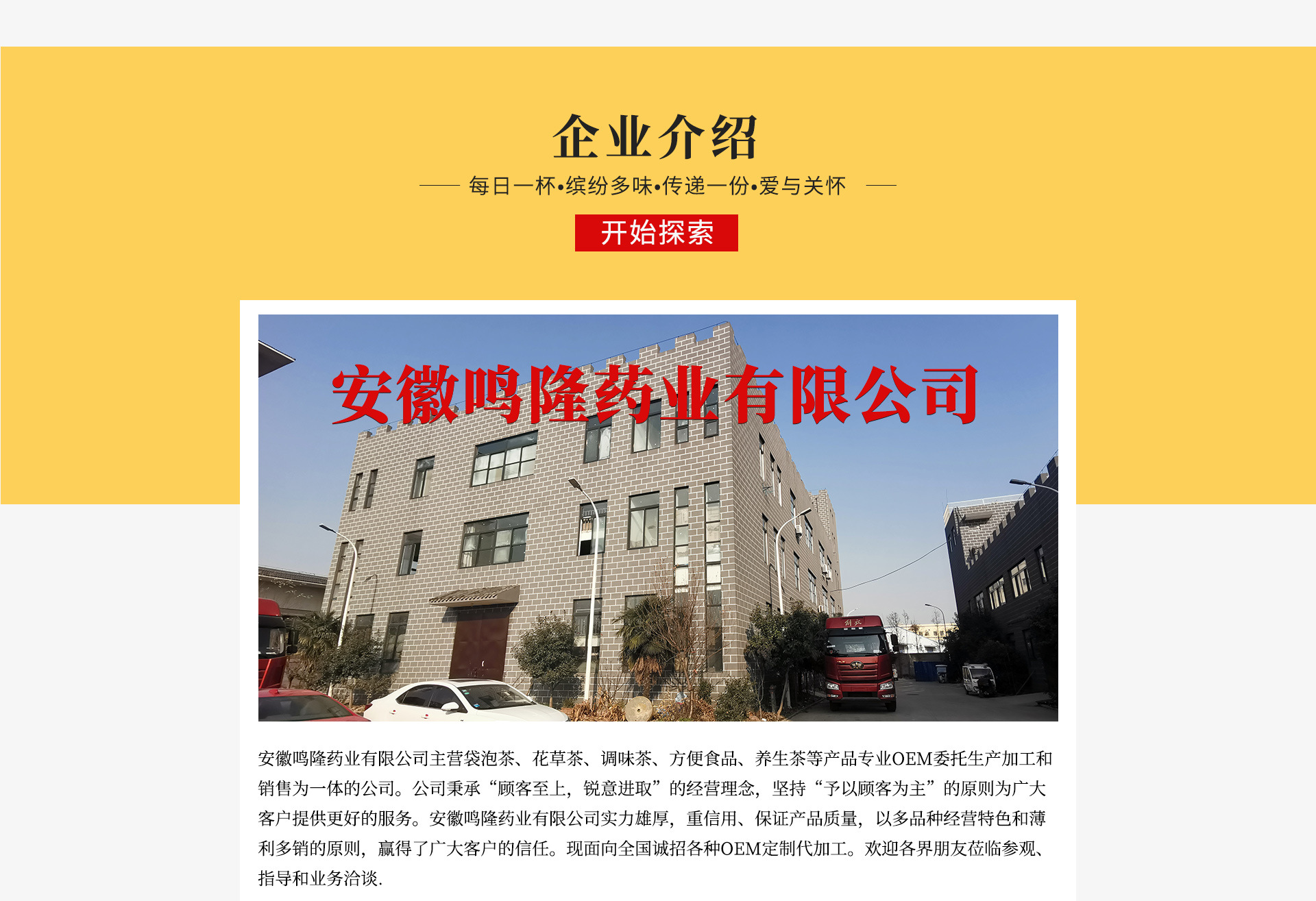 本公司主營、花草茶、調(diào)味茶、方便食品、養(yǎng)生膏滋、三角包等產(chǎn)品。專業(yè)OEM委托生產(chǎn)加工和銷售為一體的公司。公司秉承“顧客至上,銳意進取”的經(jīng)營理念,堅持“客戶為先”的原則為廣大客戶提供服務(wù)。本公司實力雄厚,重信用、保證產(chǎn)品質(zhì)量,以多品種經(jīng)營特色和薄利多銷的。贏得了廣大客戶的信任?,F(xiàn)面向各地誠招各種OEM定制代加工。歡迎各界朋友蒞臨參觀、指導和業(yè)務(wù)洽談。