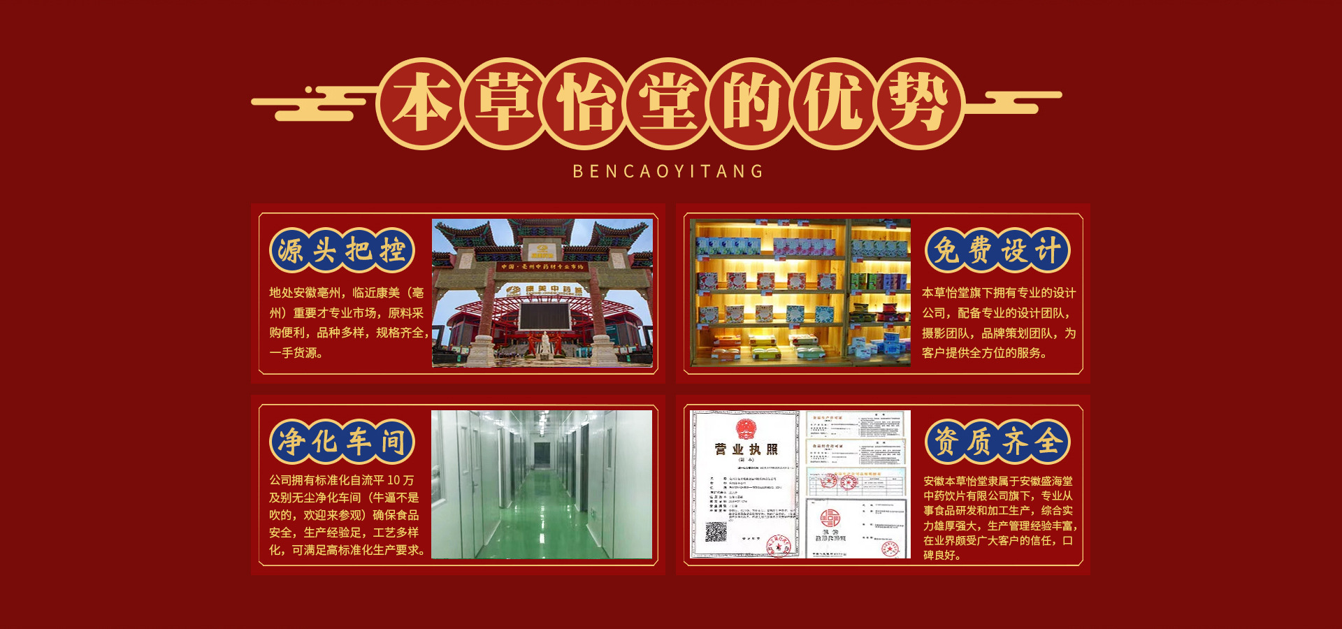 華佗普濟(jì)世家 本草養(yǎng)生天下 你好,歡迎您光臨安徽本草怡堂生物科技有限公司 本公司專業(yè)生產(chǎn)銷售和代加工固體飲料 壓片糖果 方便食品 熟粉類糕點(diǎn) 花草茶三角包 水果干制品 低溫烘培熟原料和五谷豆?jié){原料包,炒貨與堅果類食品 公司廠房面積16000平方 配備標(biāo)準(zhǔn)10萬級自流平凈化車間 共有12條全自動化生產(chǎn)線 公司已通過ISO9001質(zhì)量管理體系認(rèn)證和ISO14001環(huán)境管理體系認(rèn)證。意在打造全國養(yǎng)生行業(yè)新標(biāo)桿,竭力為客戶打造完美產(chǎn)品!