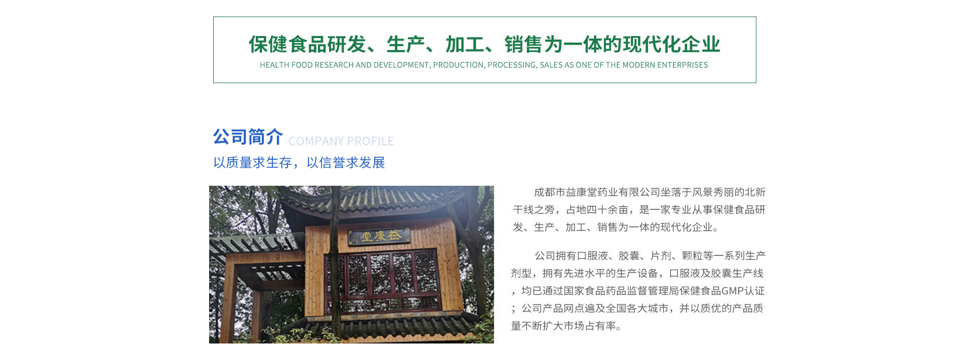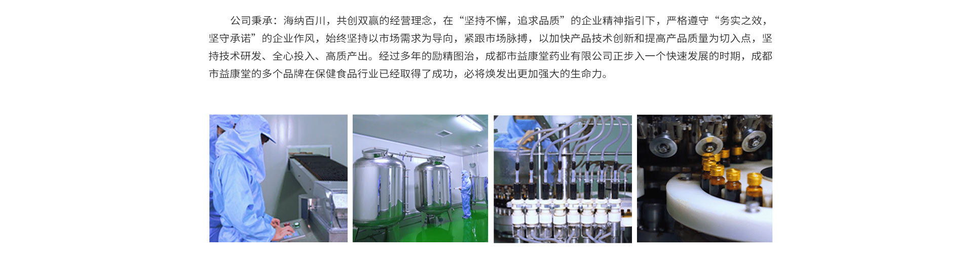 成都市益康堂藥業(yè)有限公司坐落于風景秀麗的北新干線之旁,占地四十余畝,是一家專業(yè)從事保健食品研發(fā)、生產、加工、銷售為一體的現(xiàn)代化企業(yè)。公司擁有口服液、膠囊、片劑、顆粒等一系列生產劑型,擁有先進水平的生產設備,口服液及膠囊生產線,均已通過國家食品藥品監(jiān)督管理局保健食品GMP認證。公司產品網點遍及全國各大城市,并以質優(yōu)的產品質量不斷擴大市場占有率。 公司秉承:海納百川,共創(chuàng)雙贏的經營理念,在“堅持不懈,追求品質”的企業(yè)精神指引下,嚴格遵守“務實之效,堅守承諾”的企業(yè)作風,始終堅持以市場需求為導向,緊跟市場脈搏,以加快產品技術創(chuàng)新和提高產品質量為切入點,堅持技術研發(fā)、全心投入、高質產出。經過多年的勵精圖治,成都市益康堂藥業(yè)有限公司正步入一個快速發(fā)展的時期,成都市益康堂的多個品牌在保健食品行業(yè)已經取得了成功,必將煥發(fā)出更加強大的生命力。