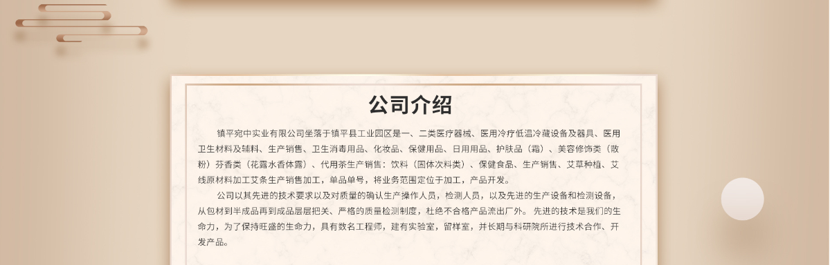 企業(yè)簡介 河南宛中實業(yè)有限公司坐落于鎮(zhèn)平縣工業(yè)園區(qū),旗下公司有:向美實業(yè)有限公司、鼎達成醫(yī)療、萬樂堂醫(yī)藥、一聰實業(yè)。是專業(yè)一、二類醫(yī)療器械、醫(yī)用冷療低溫冷藏設備及器具、醫(yī)用衛(wèi)生材料及輔料、生產(chǎn)銷售、衛(wèi)生消毒用品、化妝品、保健用品、日用用品、護膚品(霜)、美容修飾類(散粉)芬香類(花露水香體露)、代用茶生產(chǎn)銷售:飲料(固體次料類)、保健食品、生產(chǎn)銷售、艾草種植、艾線原材料加工艾條生產(chǎn)銷售加工,單品單號,始終將業(yè)務范圍定位于專業(yè)加工,專業(yè)產(chǎn)品開發(fā)。公司以其先進的技術(shù)要求以及對質(zhì)量的保證擁有專業(yè)的生產(chǎn)操作人員,優(yōu)秀的檢測人員,以及先進的生產(chǎn)設備和檢測設備,從包材到半成品再到成品層層把關(guān)、嚴格的質(zhì)量檢測制度,杜絕不合格產(chǎn)品流出廠外。 先進的技術(shù)是我們的生命力,為了保持旺盛的生命力,具有數(shù)名資深工程師,建有專業(yè)的實驗室,留樣室,并長期與著名的科研院所進行技術(shù)合作、開發(fā)先進