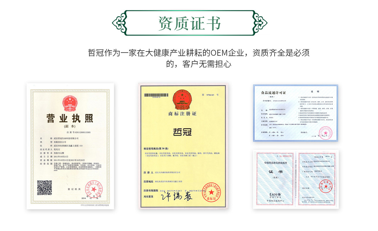 武漢哲冠生命科技有限公司,是一家專門開發(fā)、生產(chǎn)與經(jīng)營軟膠囊、硬膠囊、片劑、壓片、膏劑、保健茶、養(yǎng)生茶等保健食品OEM代加工、ODM服務(wù)的現(xiàn)代化高科技企業(yè)。擁有哲冠生物園生產(chǎn)基地、哲冠科技產(chǎn)業(yè)園、香港、北京兩大辦事處及湖北神農(nóng)架種植基地,種植面積上千畝,年產(chǎn)值上億元以上。 公司擁有高端科研機(jī)構(gòu),擁有GMP認(rèn)證和QS認(rèn)證的標(biāo)準(zhǔn)廠房,擁有從德國、日本引進(jìn)的具有國際一流水平的科研儀器、生產(chǎn)設(shè)備、全自動包裝流水線和質(zhì)量控制檢測儀器,能自動完成油水包埋、超臨萃取、真空無菌包裝等前沿的工藝和技術(shù)。在同行業(yè)中率先通過ISO9001國際質(zhì)量體系認(rèn)證、食品安全QS認(rèn)證和自營進(jìn)出口權(quán),是國內(nèi)一流的保健品專業(yè)生產(chǎn)企業(yè)。公司研發(fā)生產(chǎn)的主打產(chǎn)品 “哲冠”瑪卡、 “哲冠”蝦青素和“哲冠”鹽藻 等保健品深受食品界和保健行業(yè)的廣泛贊譽(yù),蜚聲海內(nèi)外。