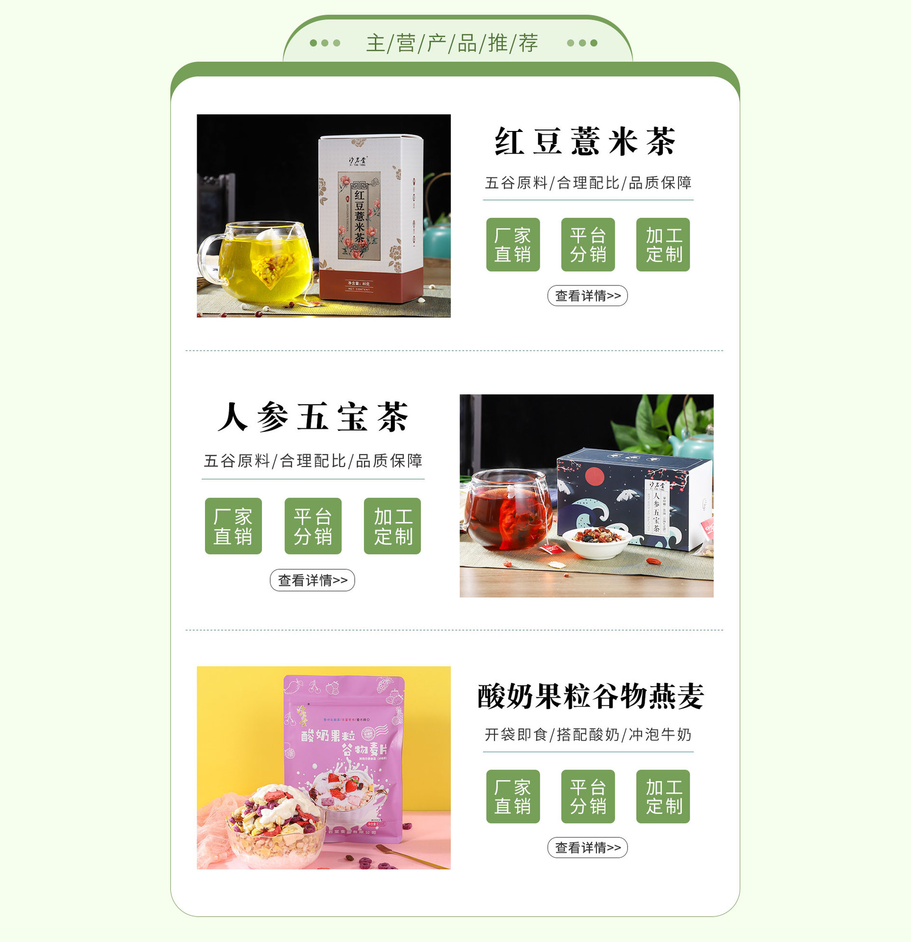 安徽汐巖堂食品有限公司,原名亳州市同仁中藥材經(jīng)營部,成立于1997年,主營農(nóng)副產(chǎn)品,道地中藥材。經(jīng)過多年的發(fā)展,公司于2020年5月斥資1000余萬元,建設(shè)代用茶、方便食品、調(diào)味茶、固體調(diào)味料等四條食品生產(chǎn)線,能夠?qū)崿F(xiàn)年1000余萬包,3000余萬元的產(chǎn)值,為全國廣大的客戶提供優(yōu)質(zhì)的產(chǎn)品。 公司秉承誠信經(jīng)營、服務(wù)至上的原則,期待著廣大客戶的合作共贏!