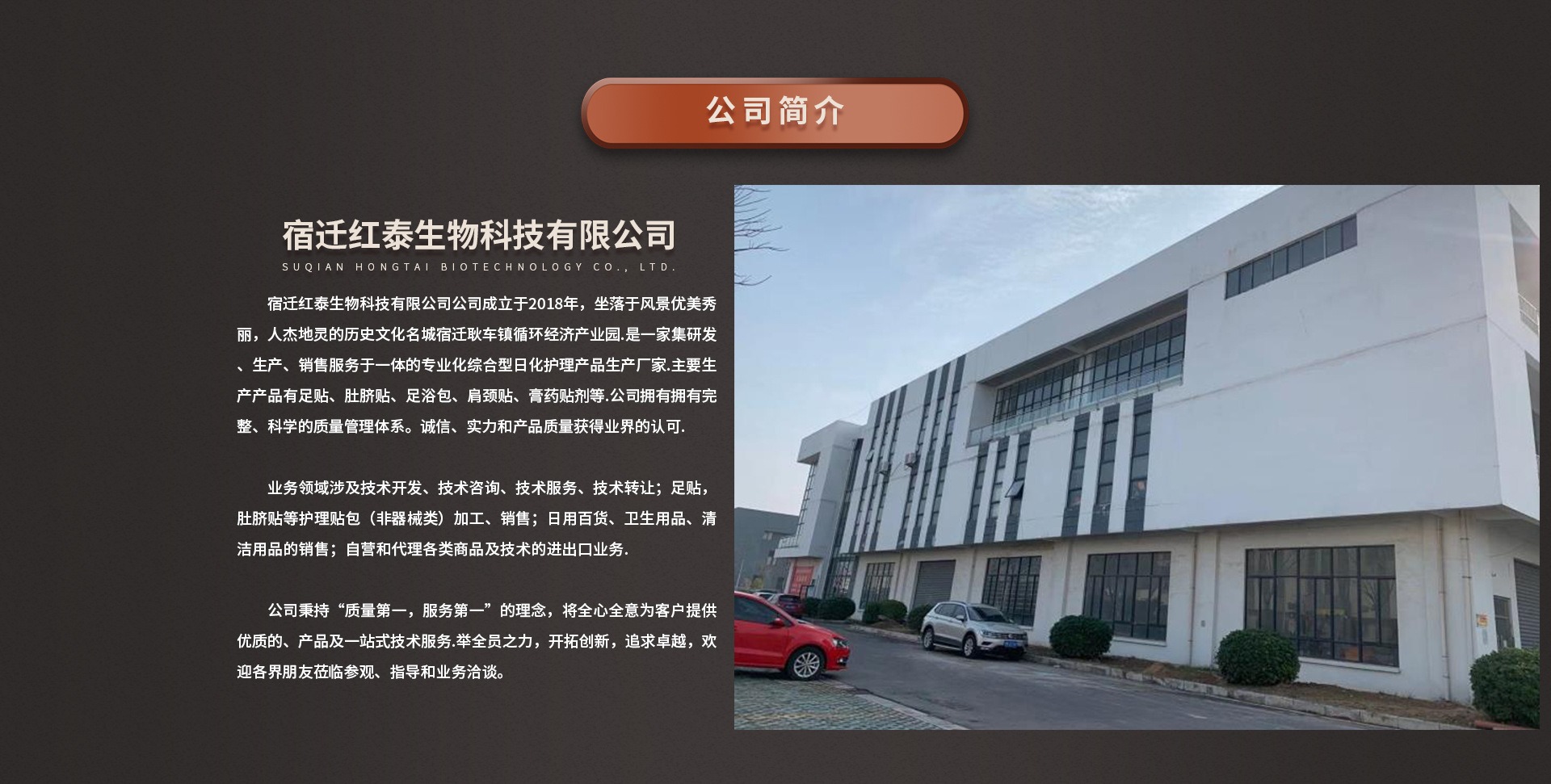 宿遷紅泰生物科技有限公司是足貼、肚臍貼、足浴包、肩頸貼、膏藥貼劑及其床上乳膠用品等日用百貨產(chǎn)品專業(yè)生產(chǎn)加工的公司,擁有完整、科學(xué)的質(zhì)量管理體系。宿遷紅泰生物科技有限公司的誠信、實力和產(chǎn)品質(zhì)量獲得業(yè)界的認(rèn)可。歡迎各界朋友蒞臨參觀、指導(dǎo)和業(yè)務(wù)洽談。