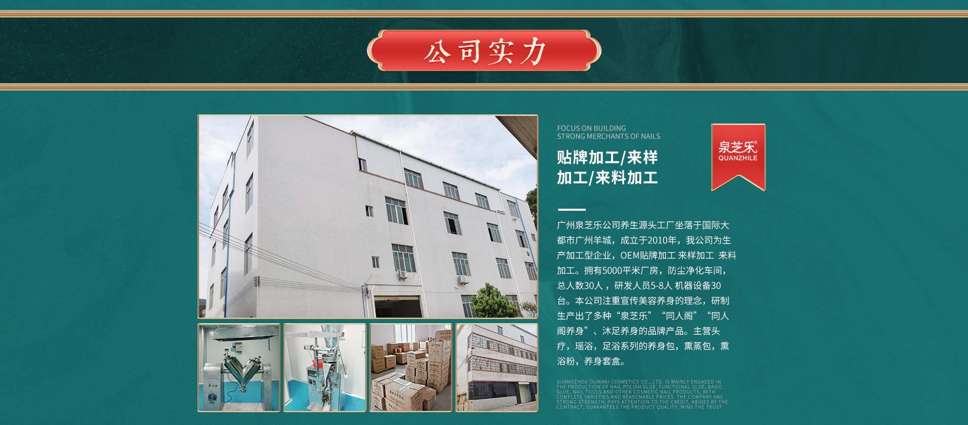 廣州泉芝樂(lè)公司養(yǎng)生保健源頭工廠坐落于國(guó)際大都市廣州羊城,成立于2010年,我公司為生產(chǎn)加工型企業(yè),OEM貼牌加工 來(lái)樣加工 來(lái)料加工。擁有5000平米廠房,防塵凈化車(chē)間,總?cè)藬?shù)30人 ,研發(fā)人員5-8人 機(jī)器設(shè)備30臺(tái)。本公司注重宣傳中藥治病、美容養(yǎng)生的理念,研制生產(chǎn)出了多種“泉芝樂(lè)”“同人閣”“同人閣養(yǎng)生”中藥美容美體、沐足養(yǎng)生的品牌產(chǎn)品。主營(yíng)頭療,瑤浴,足浴系列的中藥包,養(yǎng)生包,熏蒸包,熏浴粉,養(yǎng)生套盒,純中藥產(chǎn)后滿月恢復(fù)藥包,小兒調(diào)理藥浴等。