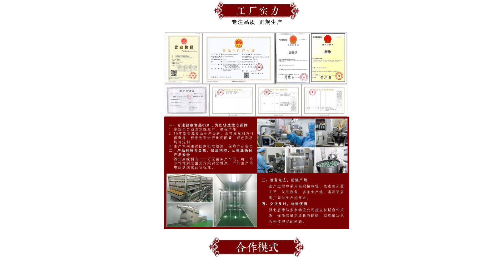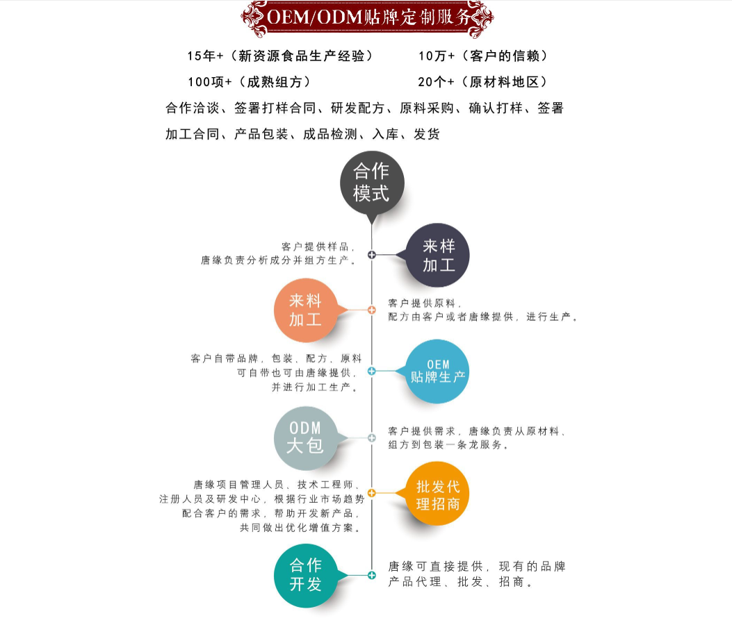 湖北唐緣生物醫(yī)藥科技有限公司坐落于“九省通衢” 的武漢。是一家集產(chǎn)品研發(fā)、生產(chǎn)、營銷、銷售為一體的 大健康全產(chǎn)業(yè)鏈綜合服務(wù)平臺。旗下?lián)碛泻碧凭壣镝t(yī) 藥科技有限公司、武漢二活堂生物工程有限公司、湖北浩 揚醫(yī)藥科技有限公司。 公司先后通過國家保健食品認證、食品生產(chǎn)許可SC 認證,擁有45000平米的高標準化潔凈廠房、30米的高規(guī) 格實驗室、多個大型原材料植基地和發(fā)酵基地、國內(nèi)外優(yōu) 質(zhì)原材料供應(yīng)商。產(chǎn)品體系涵蓋膏方/膏滋、飲料濃漿、 固體飲料、壓片糖果、袋泡茶、丸劑,六大劑型,現(xiàn)已有特 膳食品、新資源食品食品300余種。產(chǎn)品質(zhì)量、銷量、生 產(chǎn)規(guī)模、產(chǎn)能、產(chǎn)量居全國同類企業(yè)領(lǐng)先水平。作為中國 百家知名企業(yè)指定服務(wù)商,在業(yè)內(nèi)久負盛名,建立了良好口 碑和卓越商譽。