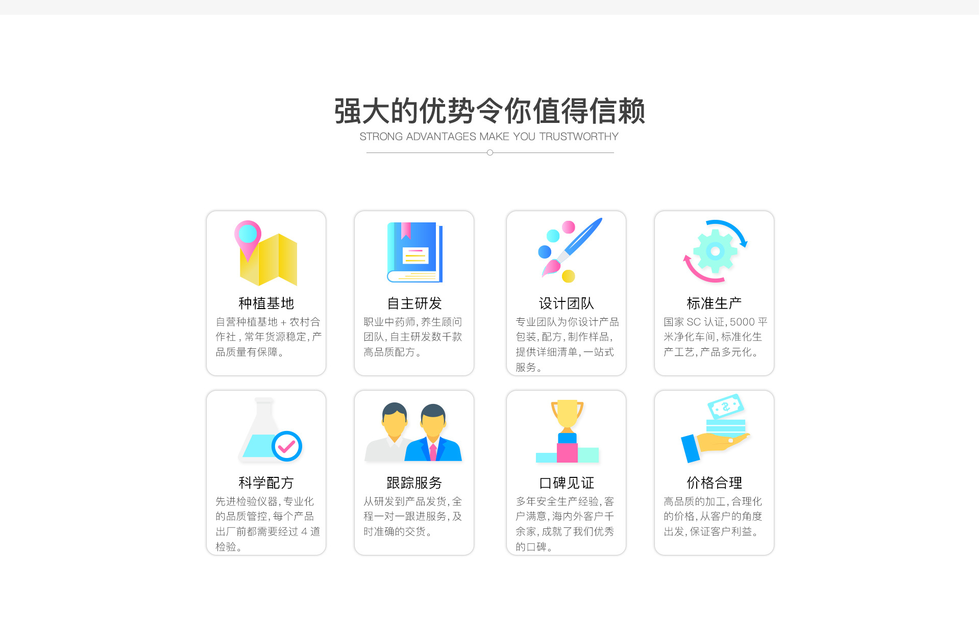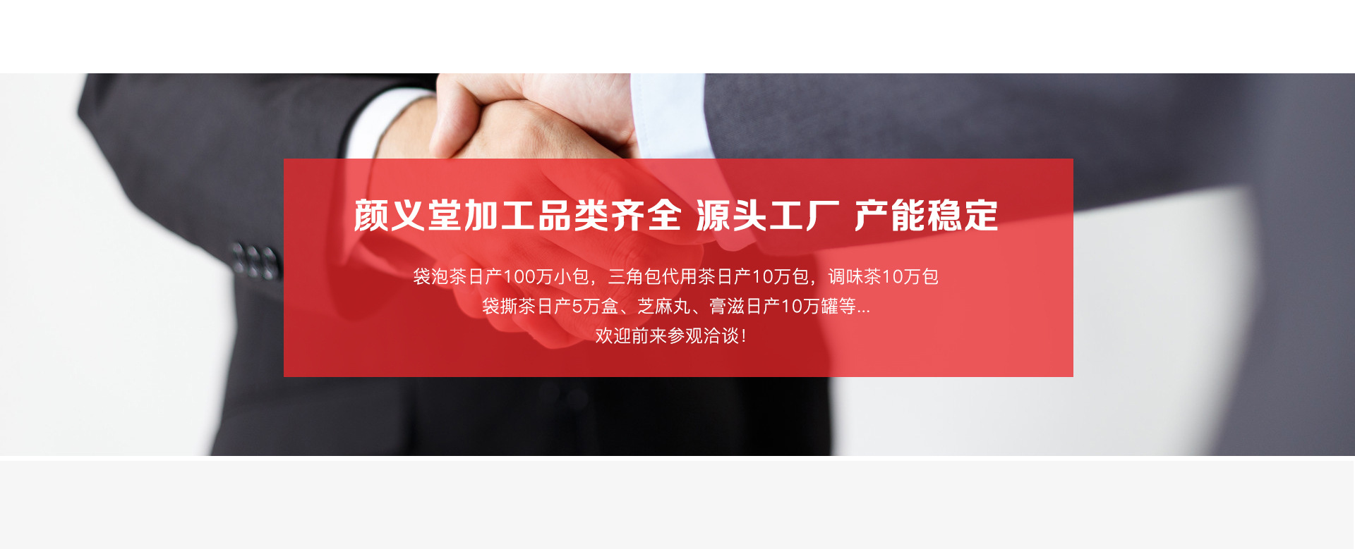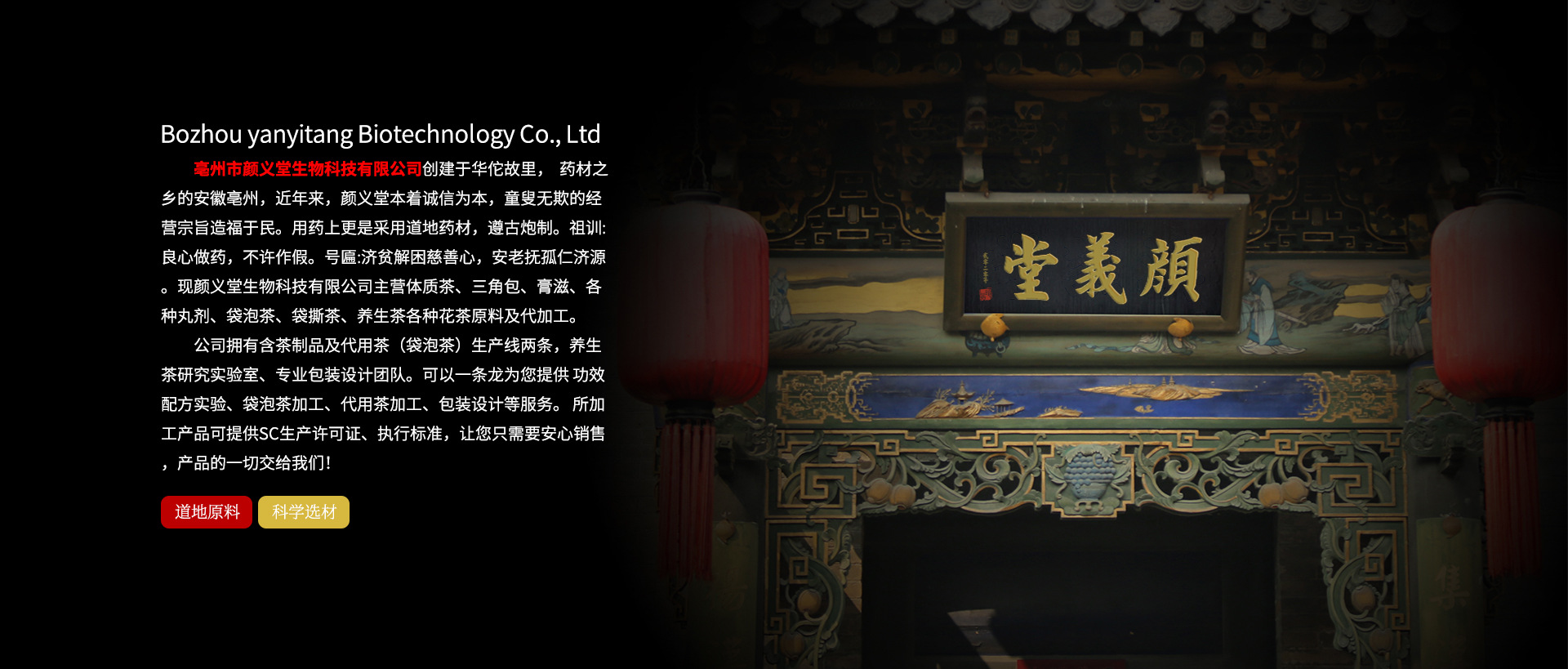 亳州市顏義堂生物科技有限公司 創(chuàng)建于華佗故里, 藥材之鄉(xiāng)的安徽亳州,近年來,顏義堂本著誠信為本,童叟無欺的經(jīng)營宗旨造福于民。用藥上更是采用道地藥材,遵古炮制。祖訓(xùn):良心做藥,不許作假。號匾:濟(jì)貧解困慈善心,安老撫孤仁濟(jì)源?,F(xiàn)顏義堂生物科技有限公司主營體質(zhì)茶、三角包、水果片茶、袋泡、袋撕茶、養(yǎng)生茶、膏滋、丸劑代加工。公司擁有含茶制品及代用茶(袋泡茶)生產(chǎn)線兩條,養(yǎng)生茶研究實(shí)驗(yàn)室、專業(yè)包裝設(shè)計(jì)團(tuán)隊(duì)。可以一條龍為您提供功效配方實(shí)驗(yàn)、袋泡茶加工、代用茶加工、包裝設(shè)計(jì)等服務(wù)。 所加工產(chǎn)品可提供SC生產(chǎn)許可證、執(zhí)行標(biāo)準(zhǔn),讓您只需要安心銷售,產(chǎn)品的一切交給我們!