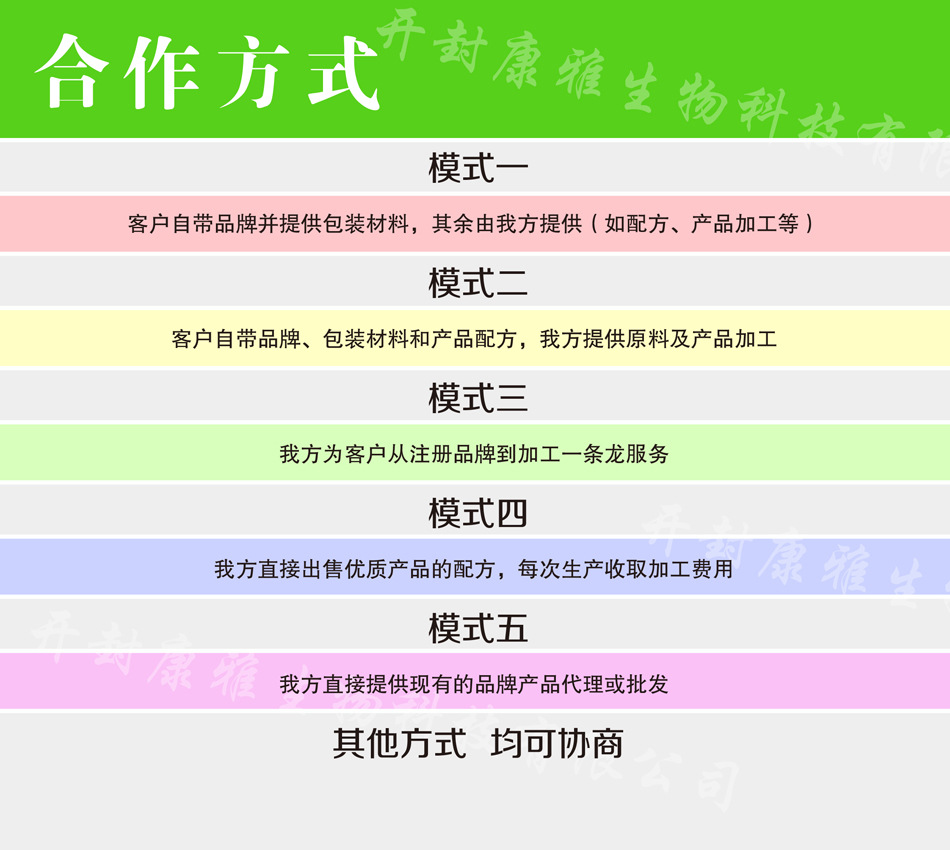 開封市康雅生物科技有限公司坐落于中國黃河之濱“八朝古都”的開封。公司成立于2016年,注冊資金1000萬元人民幣,擁有3000平方的凈化車間,獲得SC食品安全生產(chǎn)許可和GMP十萬級凈化車間認可,是一家集生物技術(shù)研究、開發(fā)、生產(chǎn)、銷售為一體的現(xiàn)代化高新技術(shù)企業(yè)。積厚德、存正心、樂敬業(yè)、誠為本,為我們公司的基本理念。 康雅生物擁有有產(chǎn)品研發(fā)能力的員工團隊;擁有諸多儀器的實驗室和檢測手段;擁有壓片糖果、固體飲料、代用茶、凝膠糖果、粉劑、顆粒等多種劑型的生產(chǎn)線,期待與您合作。