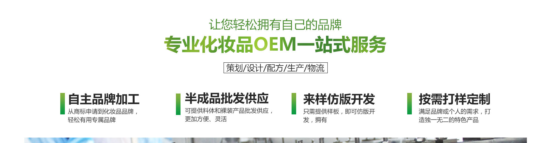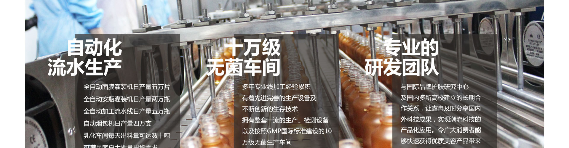 廠區(qū)占地面積達20000多平方米,工廠擁有十萬級G M P標準生產(chǎn)車間,先進的生產(chǎn)檢驗設(shè)備和國內(nèi)一流的生產(chǎn)環(huán)境,工廠通過了ISO9001、ISO9002、ISO9003、G M P體系認證。工廠生產(chǎn)的化妝品均通過國家授權(quán)機構(gòu)的第三方檢驗。