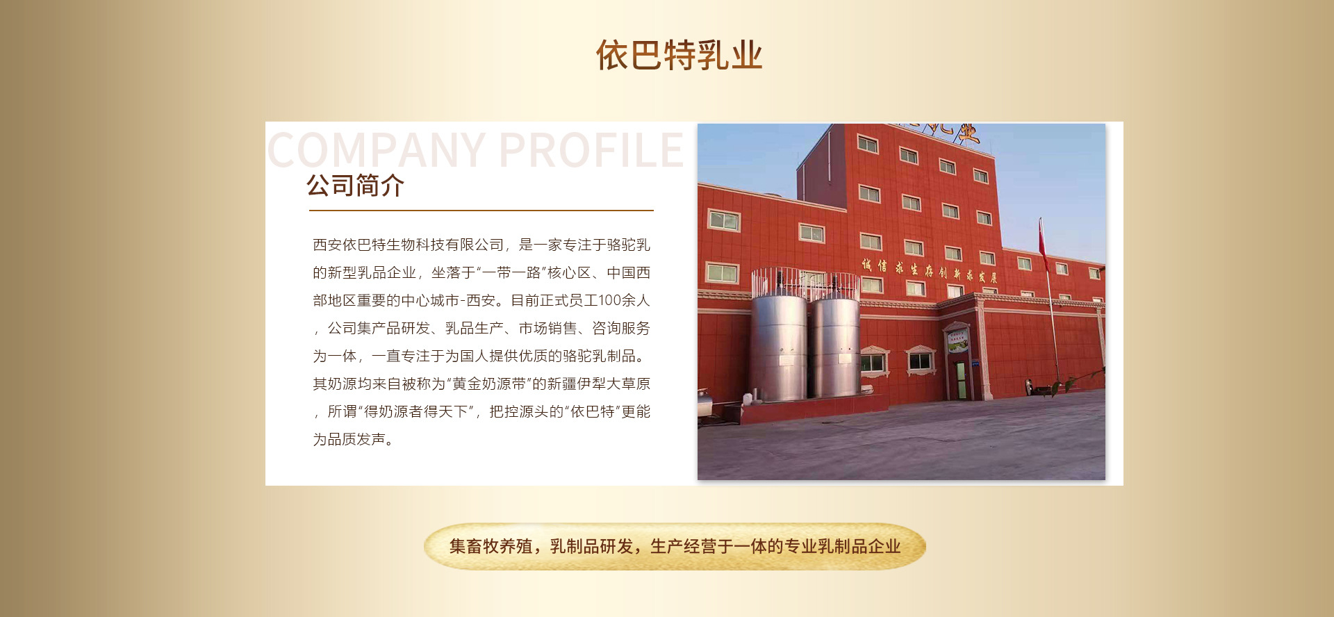 伊犁雪蓮乳業(yè)有限公司,成立于2005年,位于新疆素有“塞外江南”的伊犁河谷,美麗的杏鄉(xiāng)——伊寧縣,城南開發(fā)區(qū)伊吉路32號。企業(yè)是集畜牧養(yǎng)殖,乳制品研發(fā),生產(chǎn)經(jīng)營于一體的專業(yè)乳制品企業(yè)。目前主要經(jīng)營生產(chǎn)“依巴特”系列駝乳制品。企業(yè)使命——強(qiáng)乳興農(nóng),優(yōu)乳興國。