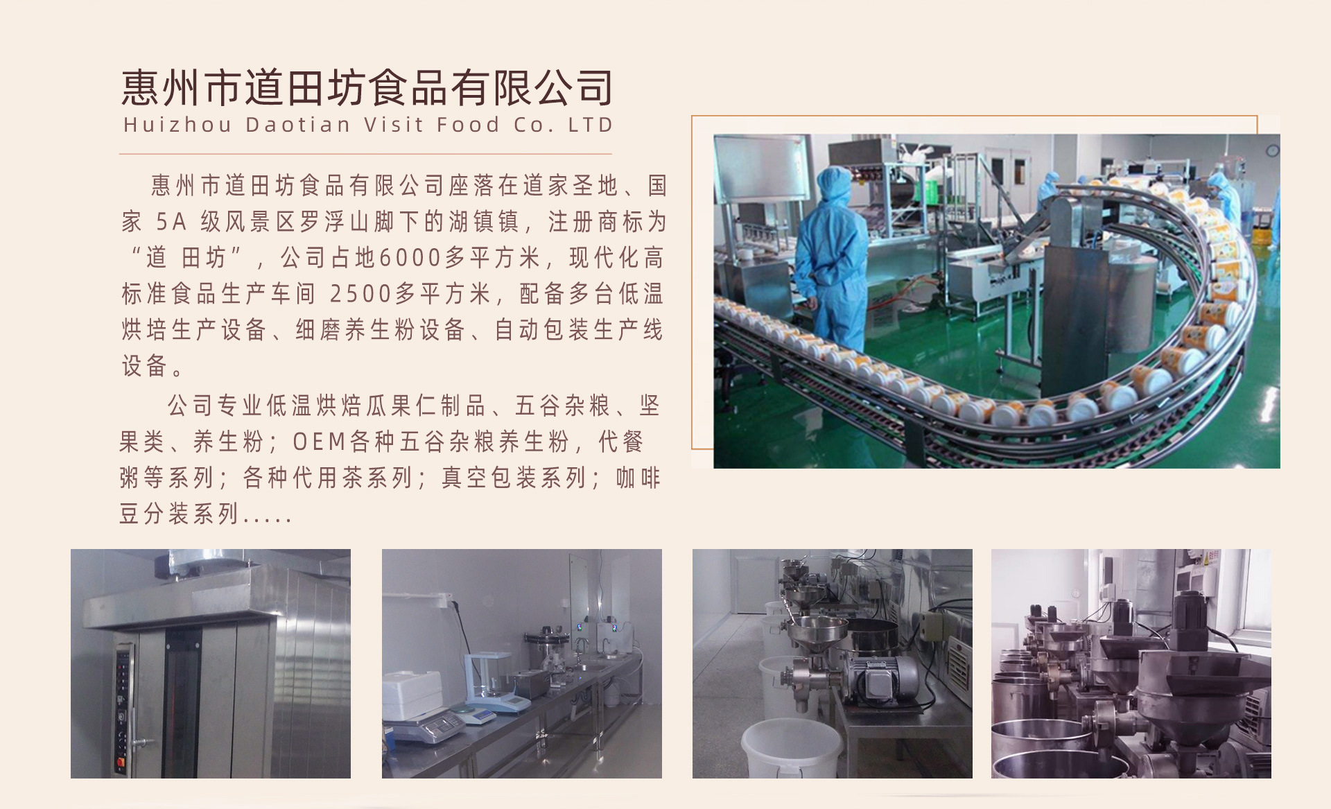 惠州市道田坊食品有限公司座落在道家圣地、國家5A級(jí)風(fēng)景區(qū)羅浮山腳下的湖鎮(zhèn)鎮(zhèn),注冊(cè)商標(biāo)為“道田坊”,公司占地6000多平方米,現(xiàn)代化高標(biāo)準(zhǔn)食品生產(chǎn)車間2500多平方米,配備國內(nèi)先進(jìn)低溫烘培生產(chǎn)設(shè)備、細(xì)磨養(yǎng)生粉設(shè)備、自動(dòng)包裝生產(chǎn)線設(shè)備。公司專業(yè)低溫烘焙瓜果仁制品、五谷雜糧、堅(jiān)果類、養(yǎng)生粉、五谷代餐粥系列產(chǎn)品,水果干制品系列產(chǎn)品,咖啡豆分裝系列,真空五谷雜糧、五谷八寶粥、五谷十寶米系列產(chǎn)品。公司擁有國內(nèi)領(lǐng)先低溫烘焙技術(shù)及生產(chǎn)加工設(shè)備,所有原材料的采購均與產(chǎn)地掛鉤收購,并進(jìn)行原材料檢測(cè)、挑選、清洗、低溫烘培、冷卻、細(xì)磨、成品檢驗(yàn)、包裝規(guī)范生產(chǎn)流程,不添加任何添加劑防腐劑,嚴(yán)格遵從國家食品安全生產(chǎn)許可標(biāo)準(zhǔn)生產(chǎn),做到每個(gè)生產(chǎn)環(huán)節(jié)嚴(yán)格把控,確保產(chǎn)品安全及營養(yǎng)的保留。 “健康無價(jià),養(yǎng)生有道?!绷_浮山作為養(yǎng)生圣地,以其豐富的植物資源、珍貴的水資源和空氣資源享譽(yù)海內(nèi)外。
