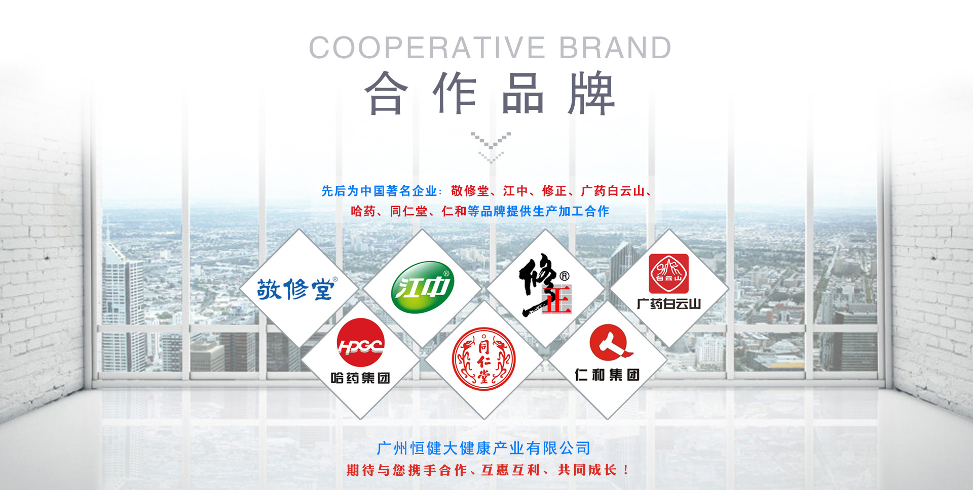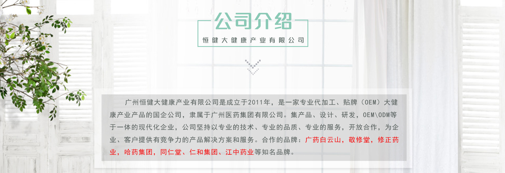 廣州恒健大健康產(chǎn)業(yè)有限公司是成立于2011年,是一家專業(yè)代加工、貼牌(OEM)大健康產(chǎn)業(yè)產(chǎn)品的國企公司,隸屬于廣州醫(yī)藥集團有限公司。集產(chǎn)品、設(shè)計、研發(fā),OEM\ODM等于一體的現(xiàn)代化企業(yè),公司堅持以專業(yè)的技術(shù)、專業(yè)的品質(zhì)、專業(yè)的服務(wù),開放合作,為企業(yè)、客戶提供有競爭力的產(chǎn)品解決方案和服務(wù)。合作的品牌:廣藥白云山,敬修堂,修正藥業(yè),哈藥集團,同仁堂、仁和集團、江中藥業(yè)等知名品牌。